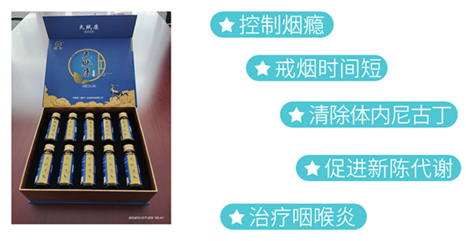 本发明是根据各种植物的特殊性味及归经,参照现代药理研究对多种相关植物进行逐个尝试和鉴别,经过多年潜心研究,而筛选出十数味相组合,最终以君、臣、佐、使绝配之方。使各味药之间即起着不同作用又能达到协同目的,可快速中和并清除肺及血液中的尼古丁,解决了吸食纸烟过去普遍戒不断的问题。即达到我所要的终极效果---戒烟。经科学秘制纯提其精华,在对百位长期吸烟成瘾者自愿申请服用新研制的戒烟口服液,体验后肯定了该口服液能快速解除对香烟的欲望,大都服用后认为这是目前戒烟者所渴望的极佳创新产品。且能缓解烟瘾时情绪不安及烦躁,喉咙咽部也清爽了,呼吸也舒畅很多。该口服液服用安全,无毒副作用,6--10天内均可达到轻松戒断烟瘾。